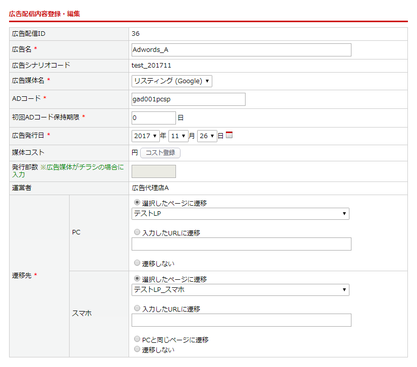 [広告媒体]タブにて、 広告媒体・広告コード・遷移先等を記入、選択。
