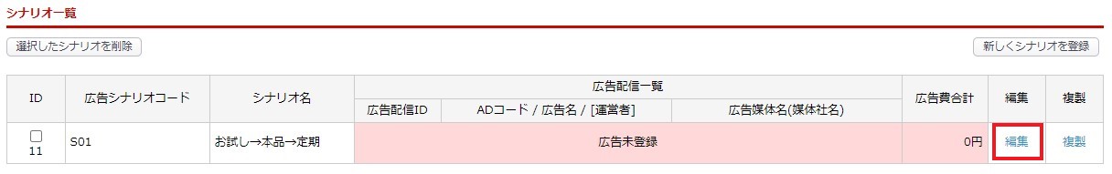 広告分析>広告シナリオ登録 シナリオの編集ボタンから