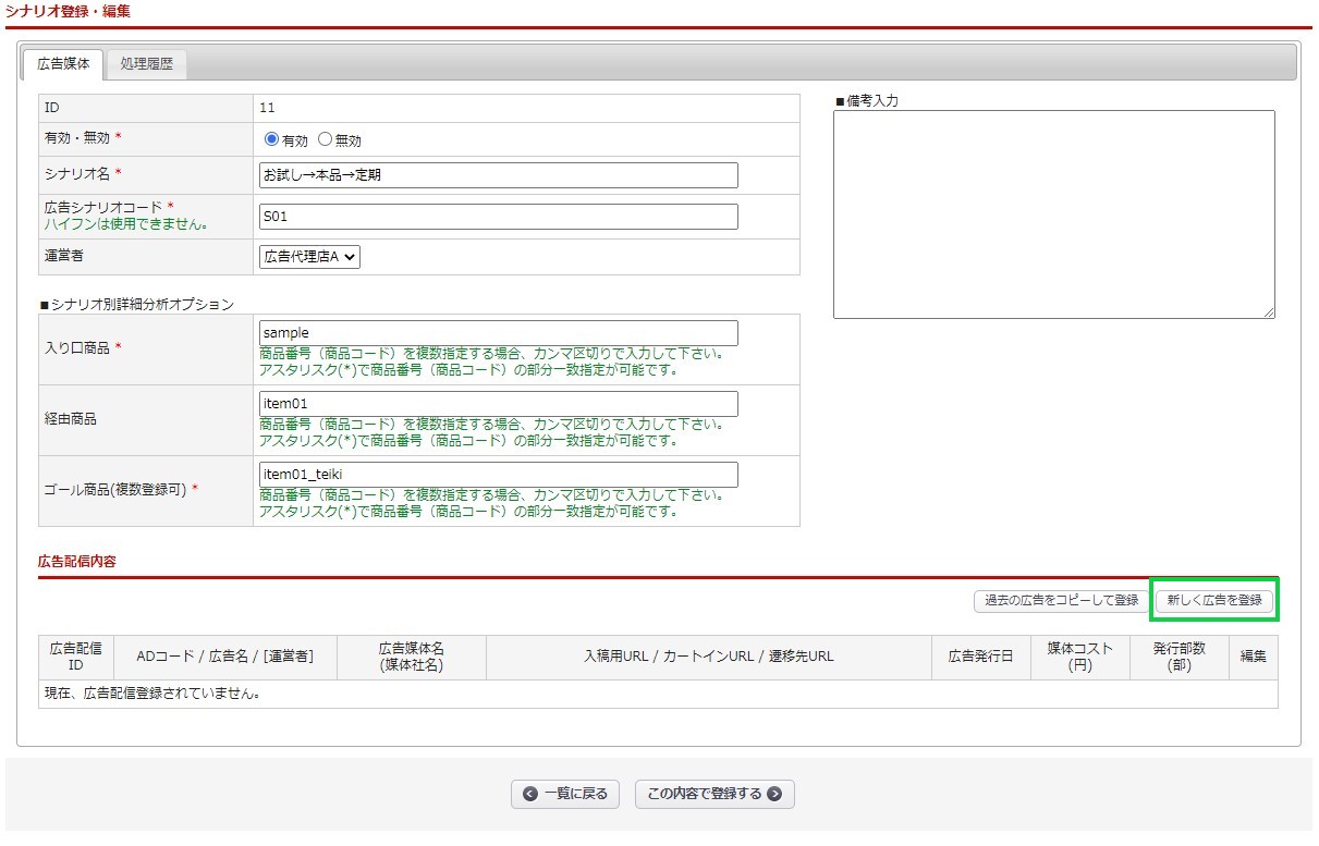 広告分析>シナリオ一覧>【新しくシナリオを登録】ボタンをクリックすると、