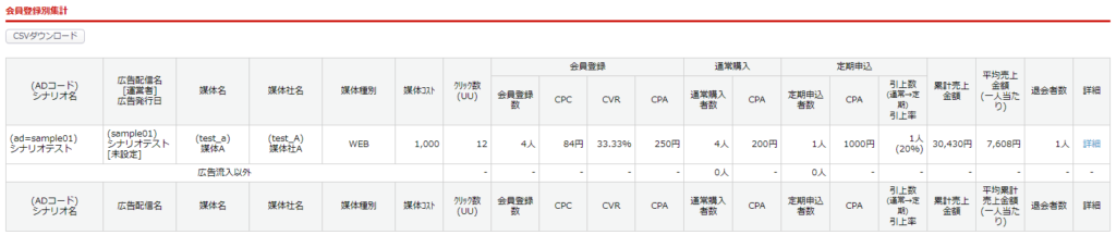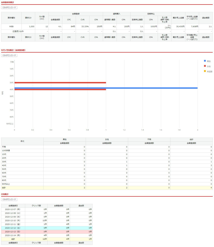 | 累計売上金額 | 対象の広告経由で会員登録された会員の売上金額合計 累計売上金額 = 商品代金合計 + 送料 + 手数料 |