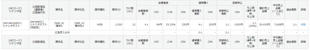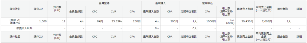 CPC,CVR,CPAの確認ができます。(※予め媒体コストの設定が必要です)