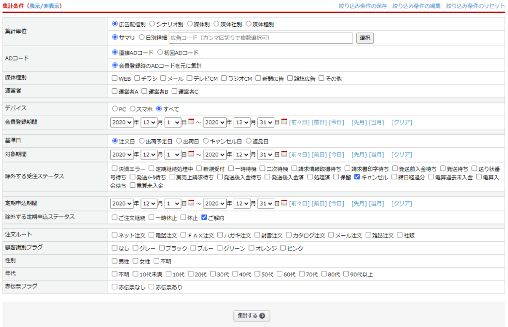 | 媒体種別 | 集計対象とするものを選択(複数選択可) ※選択のない場合は全項目が集計対象となります。 システム設定>マスターデータ管理 で登録済みの媒体種別です。 |