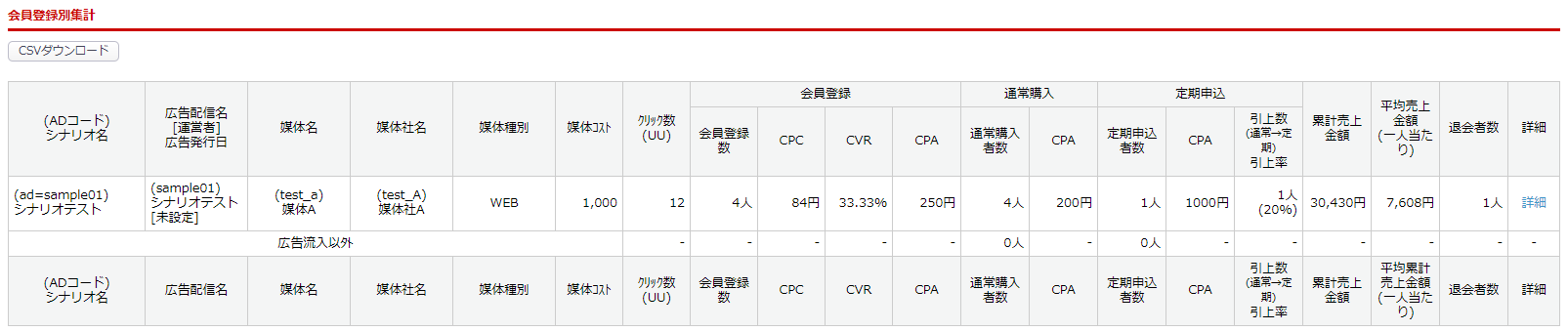 | 会員登録数 | 対象の広告経由で会員登録された人数です。 |