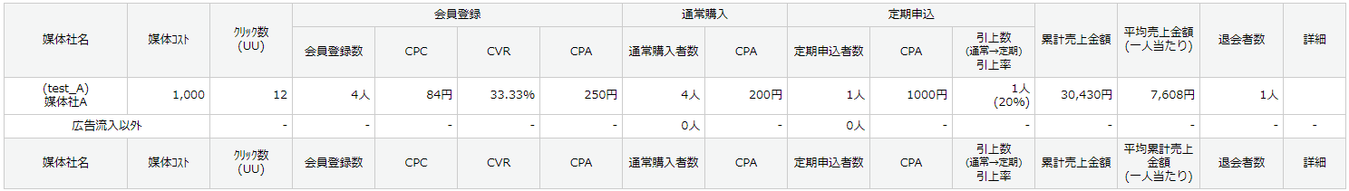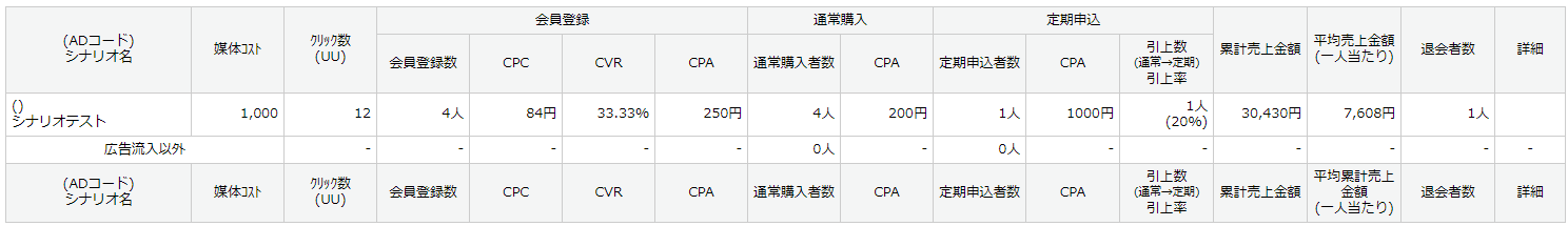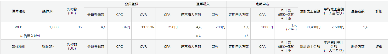 | CPA | 媒体コスト ÷ 対象の広告経由で申し込まれた定期申込者数 = CPA(円) | |