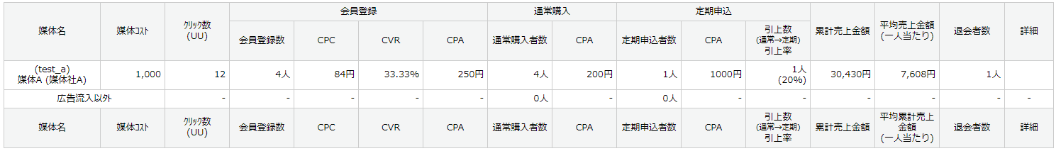CPC,CVR,CPAの確認ができます。(※予め媒体コストの設定が必要です)