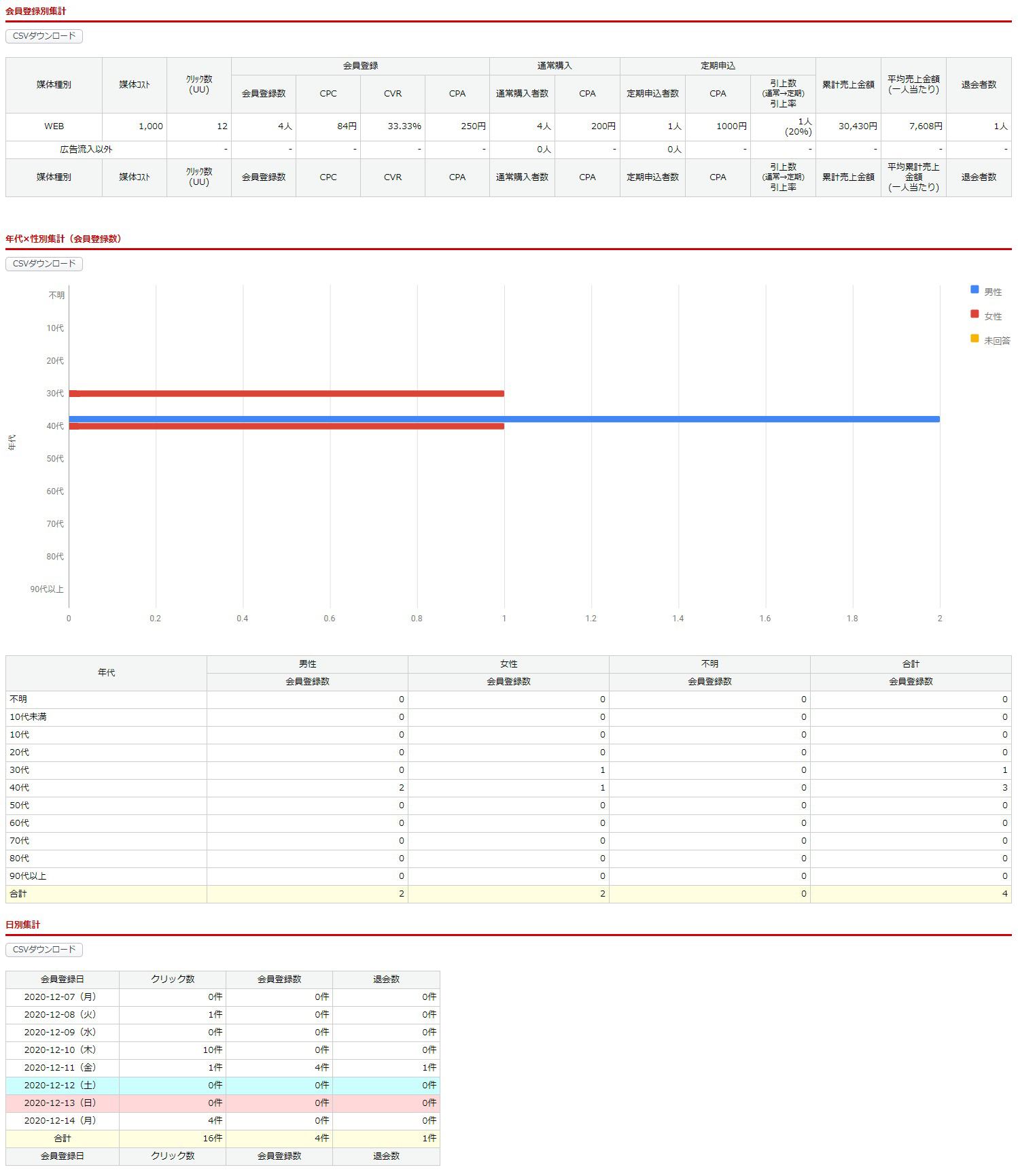 | 累計売上金額 | 対象の広告経由で会員登録された会員の売上金額合計 累計売上金額 = 商品代金合計 + 送料 + 手数料 |