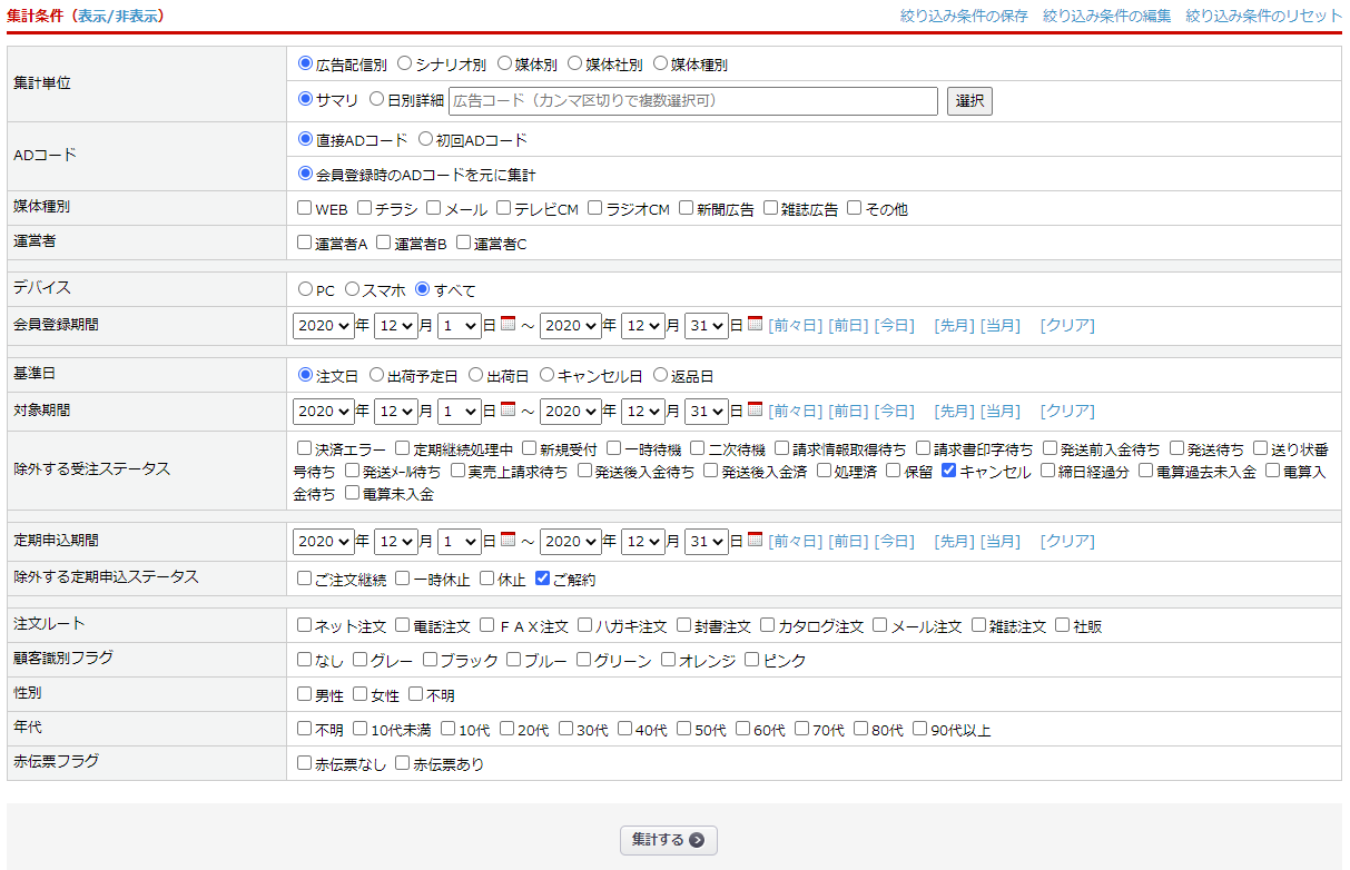 | 媒体種別 | 集計対象とするものを選択(複数選択可) ※選択のない場合は全項目が集計対象となります。 システム設定>マスターデータ管理 で登録済みの媒体種別です。 |