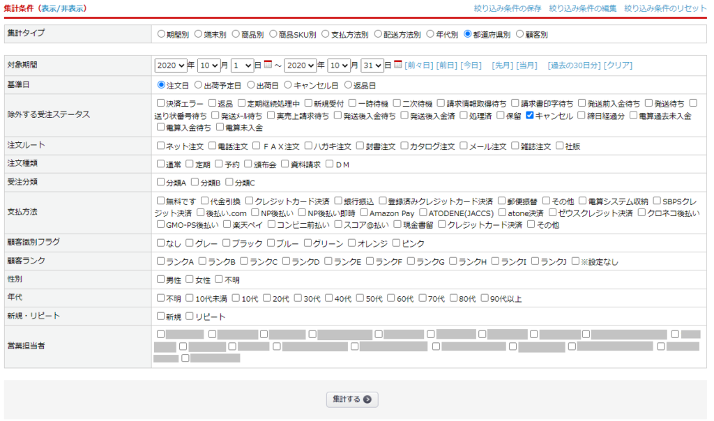 | 基準日 | 対象期間の基準とする日を設定 注文日:注文日が対象期間内の受注データを集計対象とします。 出荷予定日:出荷予定日が対象期間内の受注データを集計対象とします。 出荷日:出荷日が対象期間内の受注データを集計対象とします。 キャンセル日:キャンセル日が対象期間内の受注データを集計対象とします。 返品日:返品日が対象期間内の受注データを集計対象とします。 |