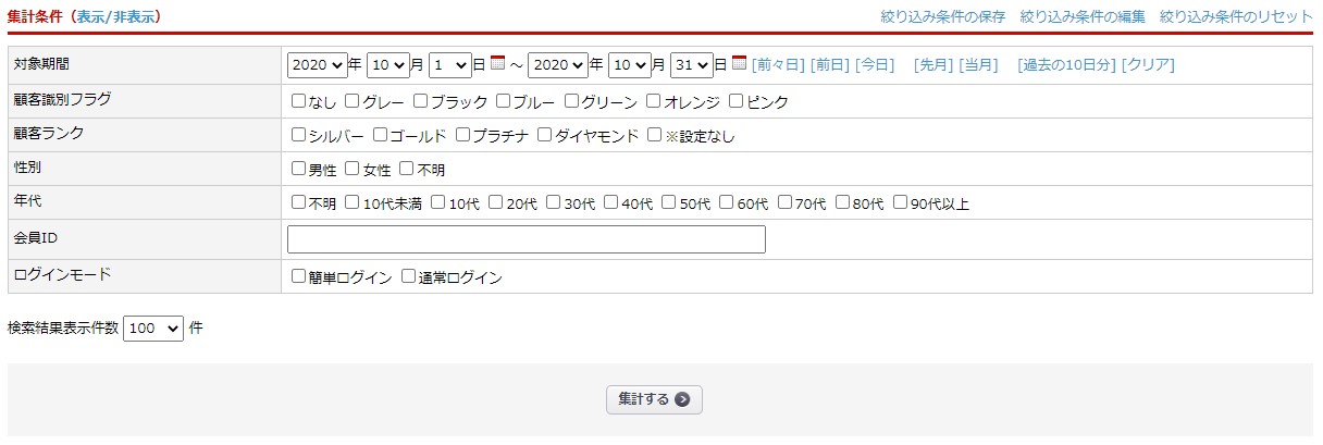 顧客識別フラグ システム設定>マスターデータ管理 の「顧客管理:顧客識別フラグ」 で登録のある各顧客識別フラグのうち、集計対象とするものを選択(複数選択可)