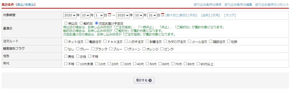 条件に合致する定期データ(受注>定期購入お申込み一覧に登録されたデータ)を集計できる機能です。