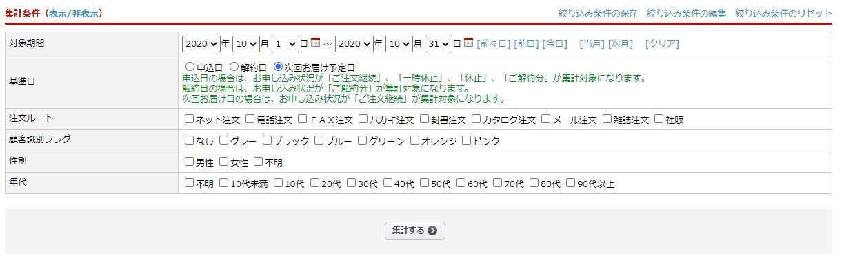 条件に合致する定期データ(受注>定期購入お申込み一覧に登録されたデータ)を集計できる機能です。
