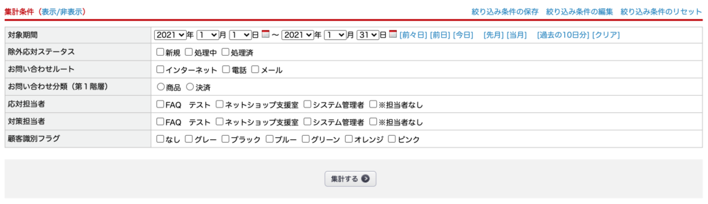 | お問い合わせルート | システム設定>マスターデータ管理 の 「顧客管理:お問い合わせルート」 で登録のある 各お問い合わせルートのうち、集計対象とするものを選択(複数選択可) ※選択のない場合は全項目が集計対象となります。 |