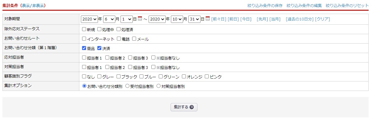 集計オプション お問い合わせ分類別、受付担当者別、対策担当者別、いずれかを指定