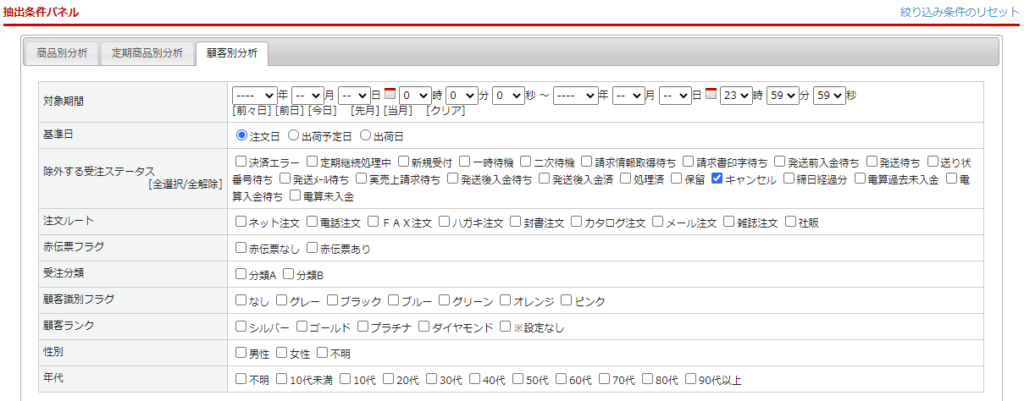| 顧客ランク | 顧客管理>顧客登録 の [顧客ランク] で登録のある 顧客ランクのうち、集計対象とするものを選択(複数選択可) ※選択のない場合は全項目が集計対象となります。 |