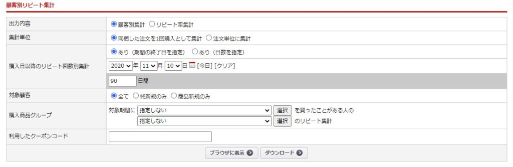 | 出力内容 | 顧客別集計かリピート率集計を指定 |