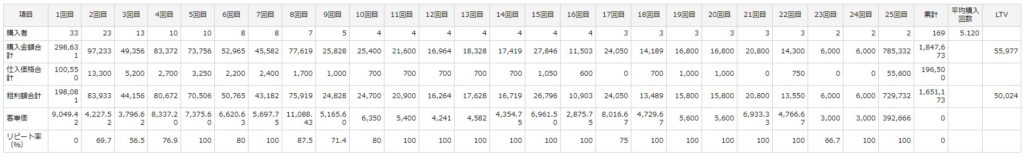 購入回数(1回目~25回目)ごとの売上データやリピート率の推移が表示され、対象期間のLTVが表示されます。