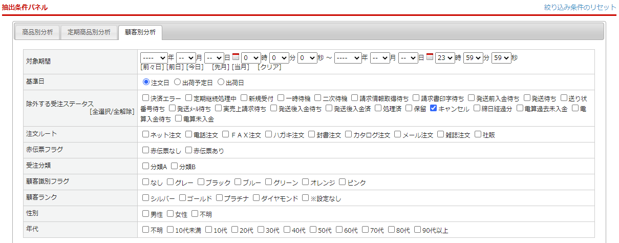 | 基準日 | 集計対象期間の基準とする日を設定 注文日:注文日が対象期間内の受注データを対象として集計します 出荷予定日:出荷予定日が対象期間内の受注データを対象として集計を行います 出荷日:出荷日が対象期間内の受注データを対象として集計を行います |