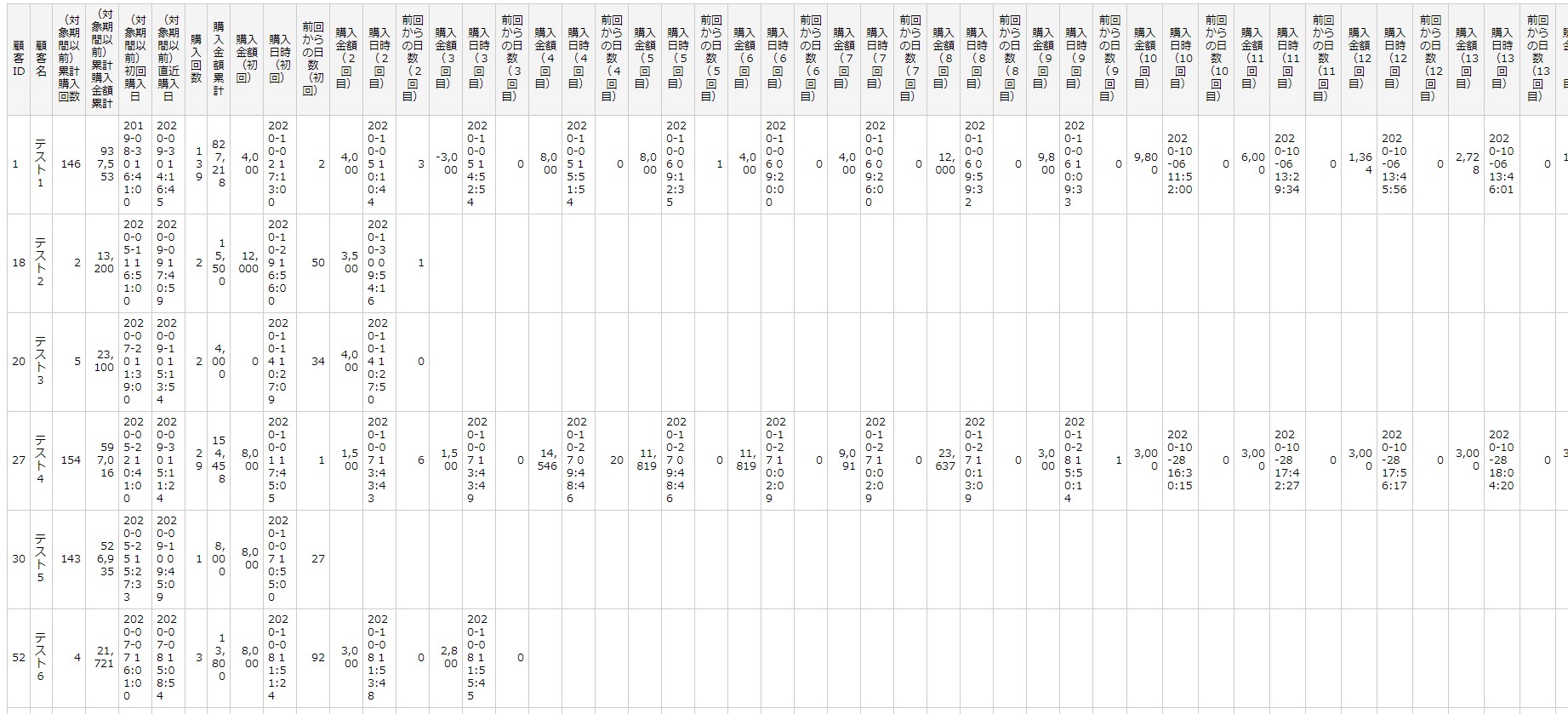 | (対象期間以前)累計購入金額累計 | 条件で指定した対象期間以前の購入金額の累計 ※集計値は全商品の累計 |