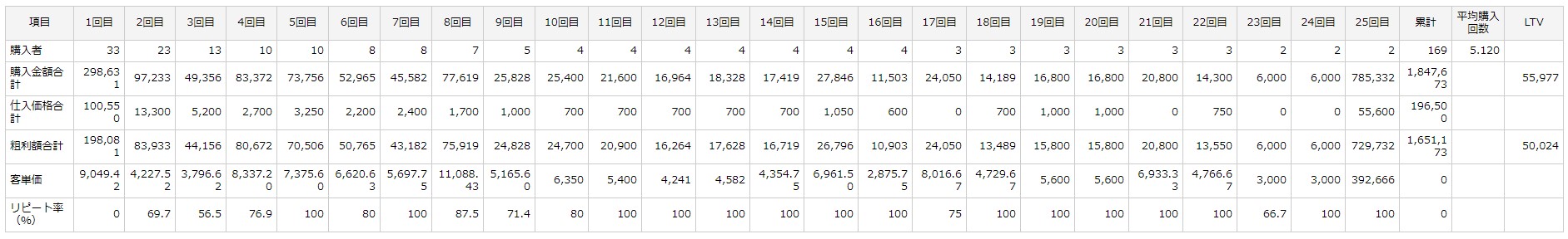 購入回数(1回目~25回目)ごとの売上データやリピート率の推移が表示され、対象期間のLTVが表示されます。