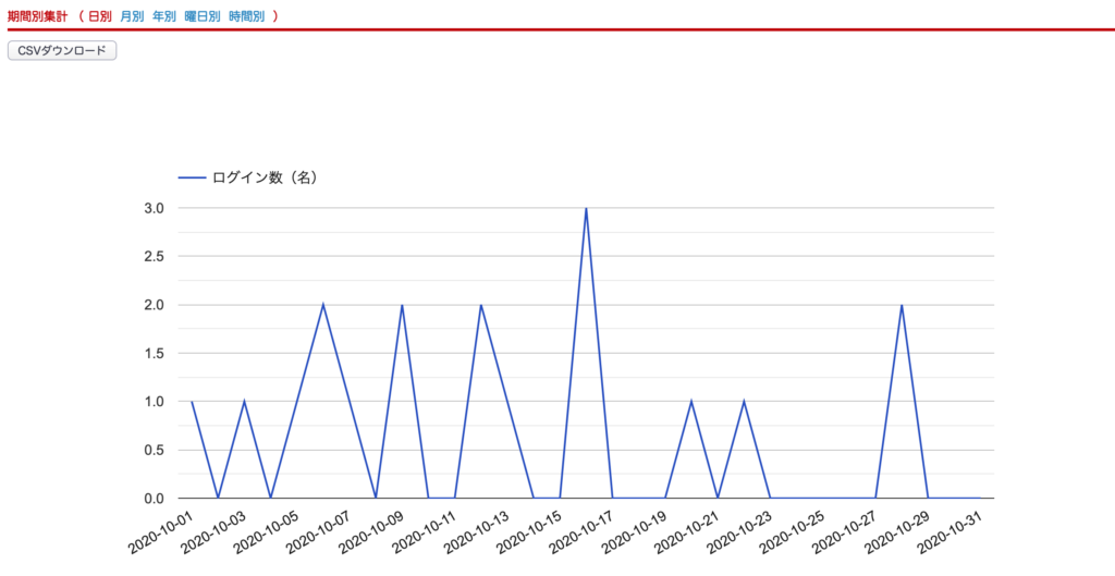 対象期間を指定し、日別・月別・年別・曜日別・時間別 で集計データを確認できます。