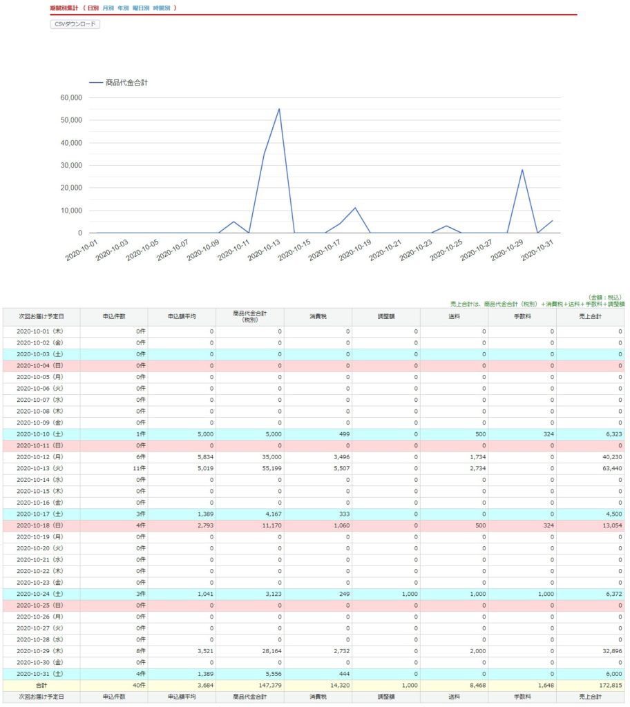 全体の売上、新規、リピート、定期申込別に、売り上げや件数の確認ができます。