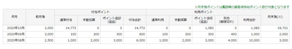 月毎に、付与ポイントや利用ポイントのデータが確認できます。