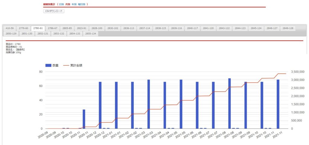 各商品ごとの「売上数量」「売上高(円)」「売上件数」の集計が可能です。