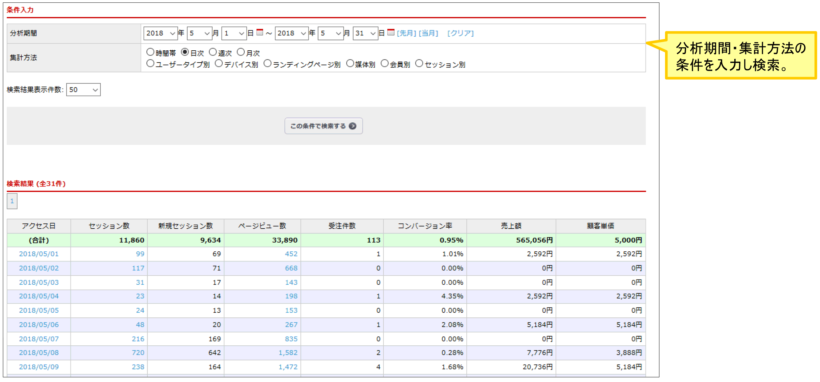 セッション数と受注件数からのコンバージョン率や、アクセス時間、ページビュー数、そこから購入された商品など、ユーザーの動きを確認することも可能です。