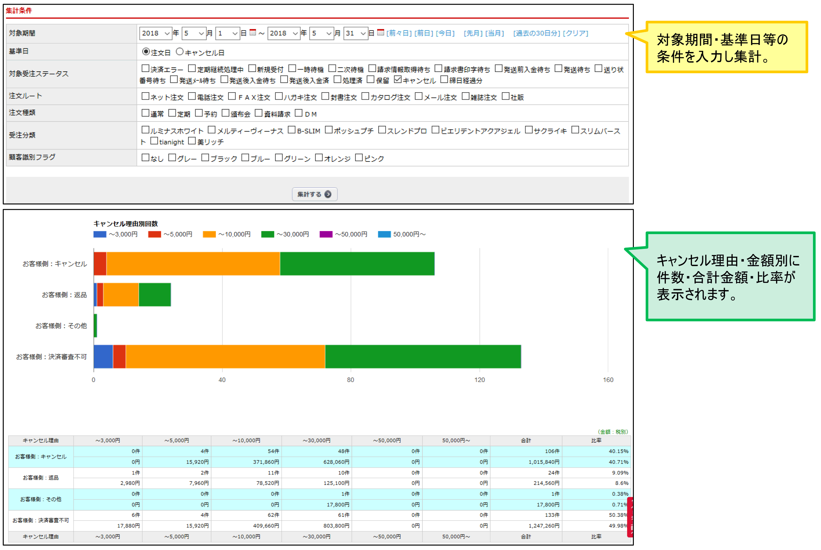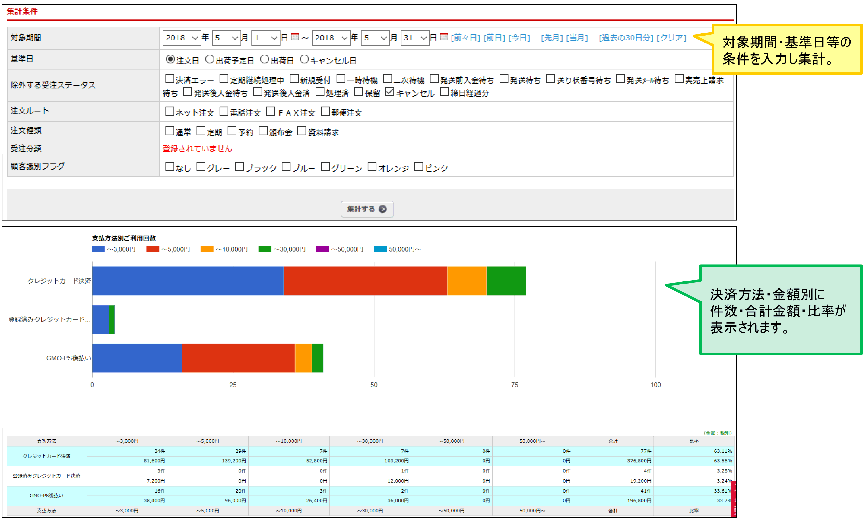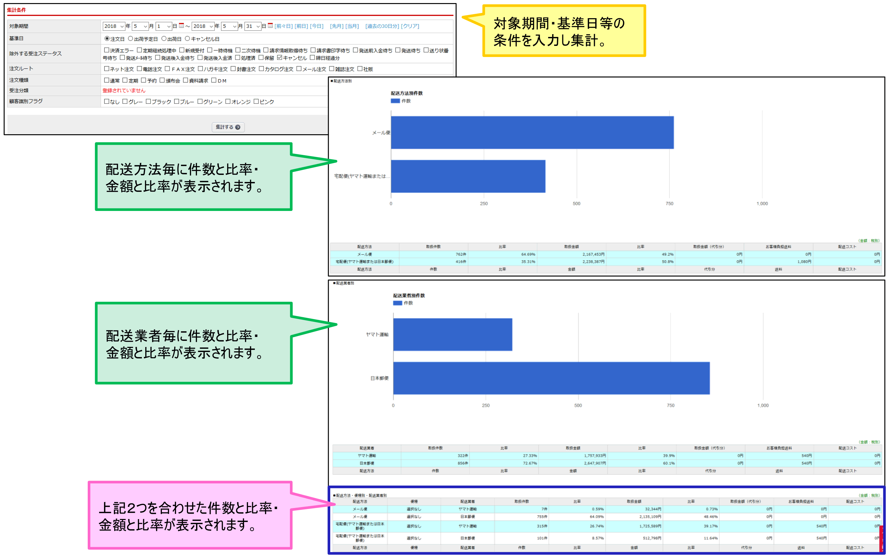 配送方法別の比率や、取扱金額、お客様負担送料や、配送コストなどのデータ集計が確認できます。