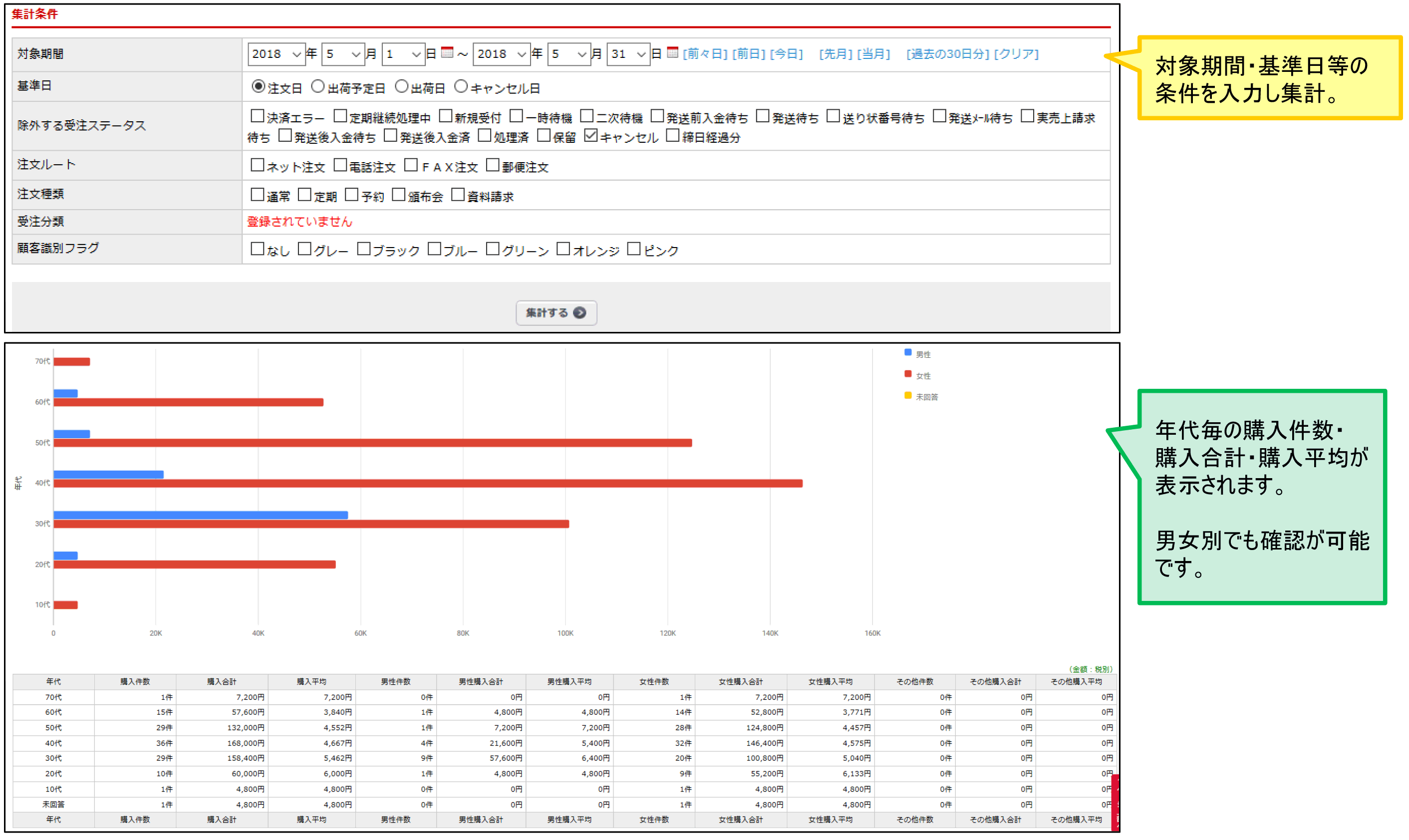店舗ユーザーの主な年代層や、年代別の受注データを確認することが出来ます。
