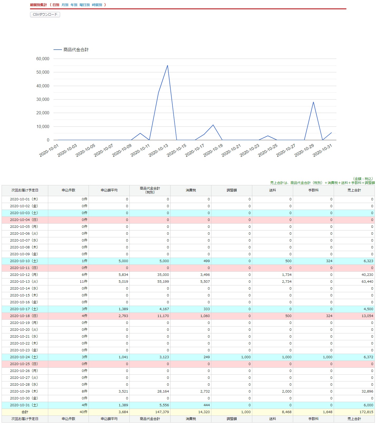 申込額の平均や、商品代金合計、送料や手数料など項目別に確認ができます。