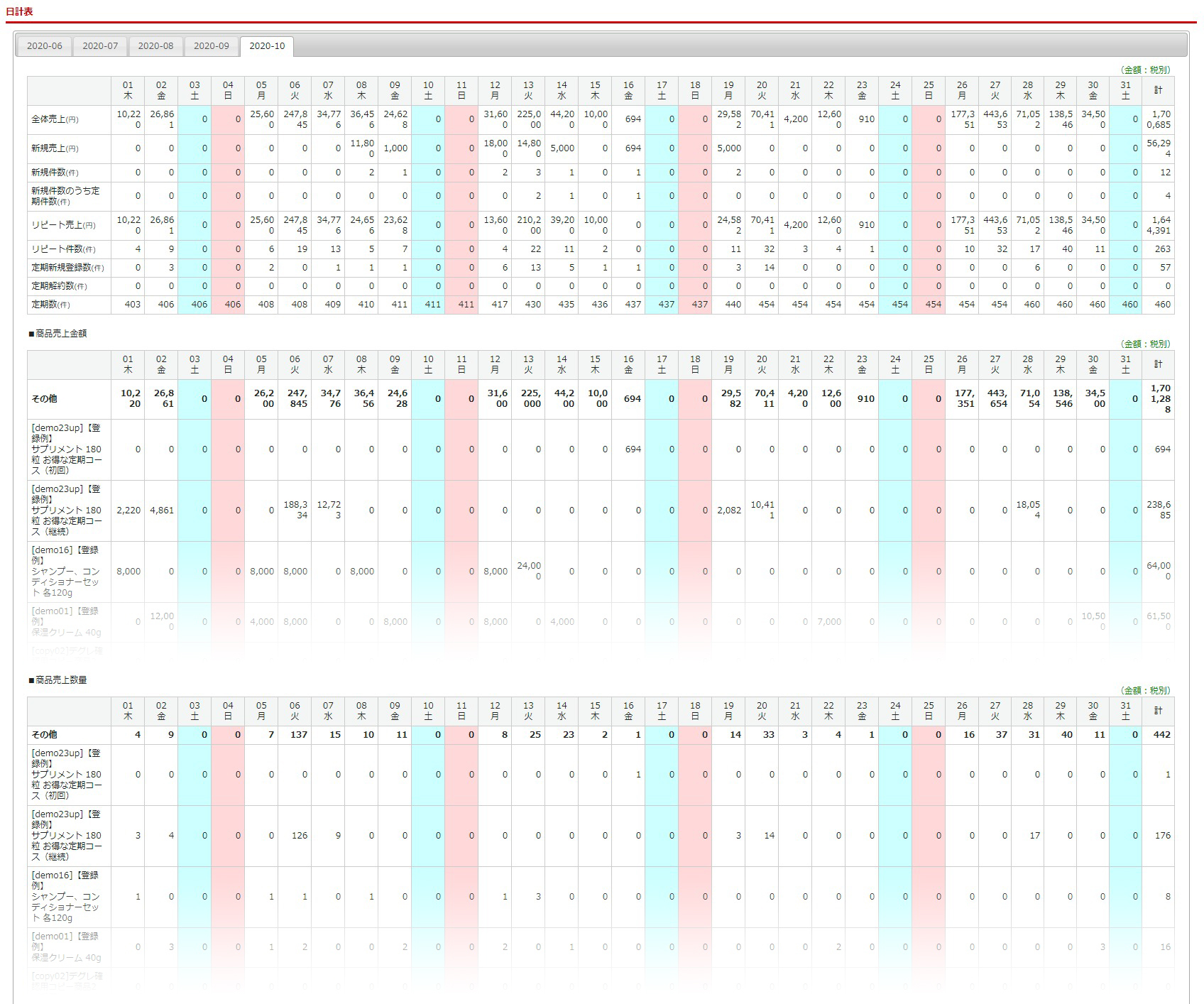 全体の売上、新規、リピート、定期申込別に、売り上げや件数の確認ができます。