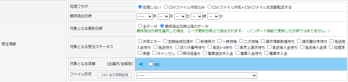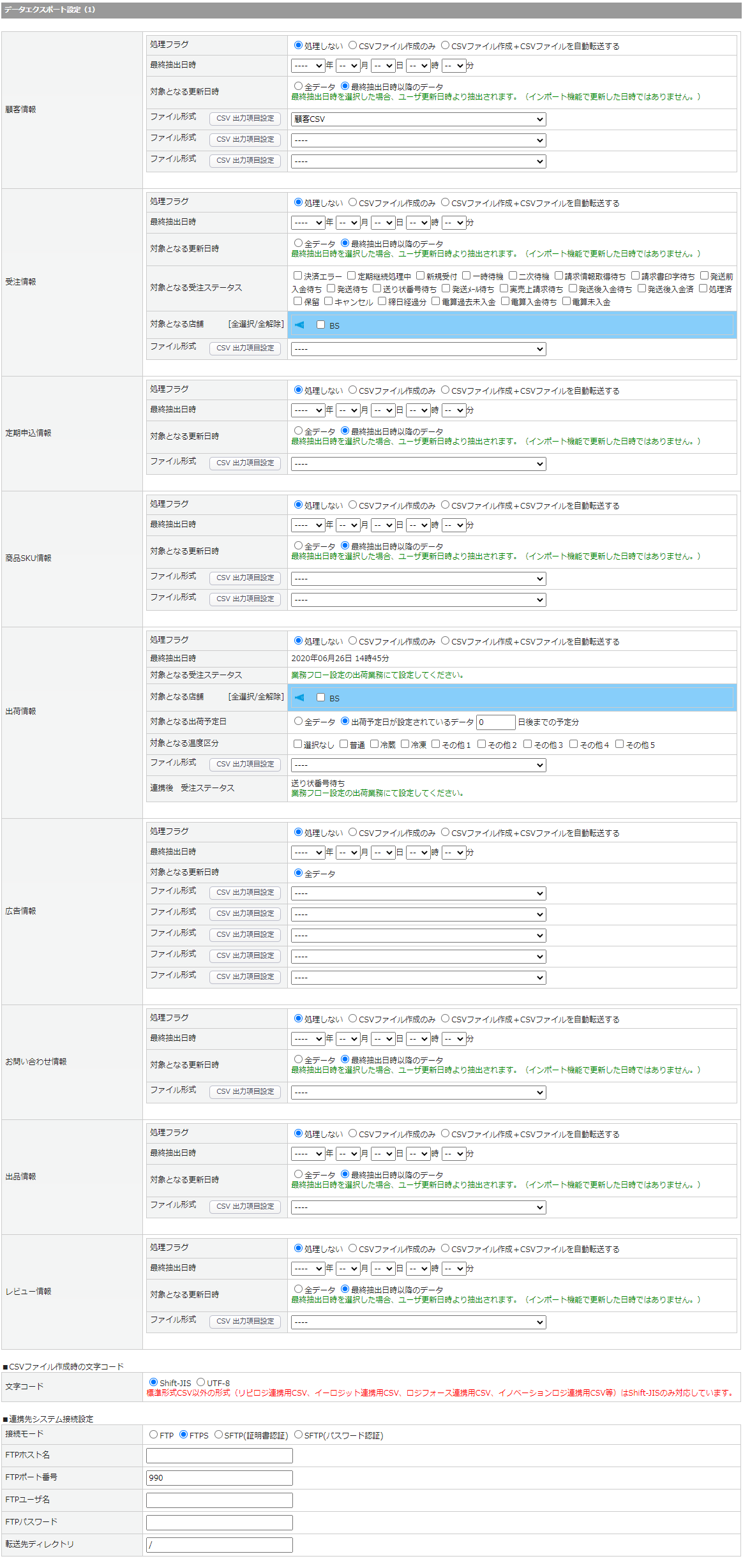 各種データについて、処理フラグやCSVファイル形式のエクスポート設定を行います。