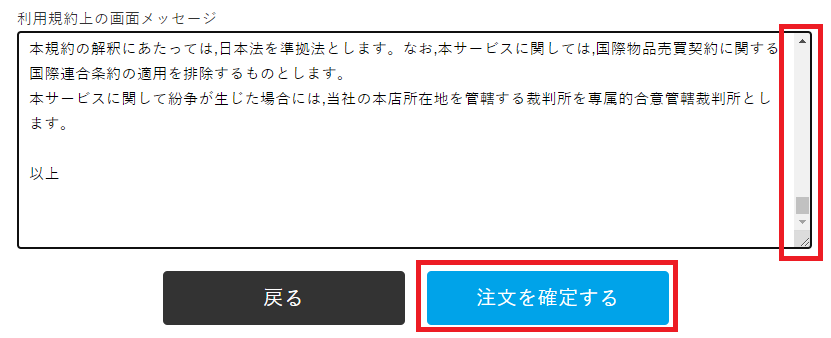 利用規約を最下部までスクロールすると、注文確定ボタンがクリック可能となります。