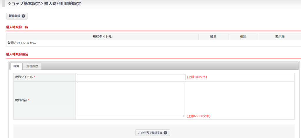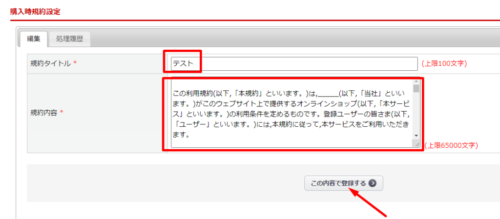規約タイトル(上限100文字)と規約内容(上限65000文字)を入力し、