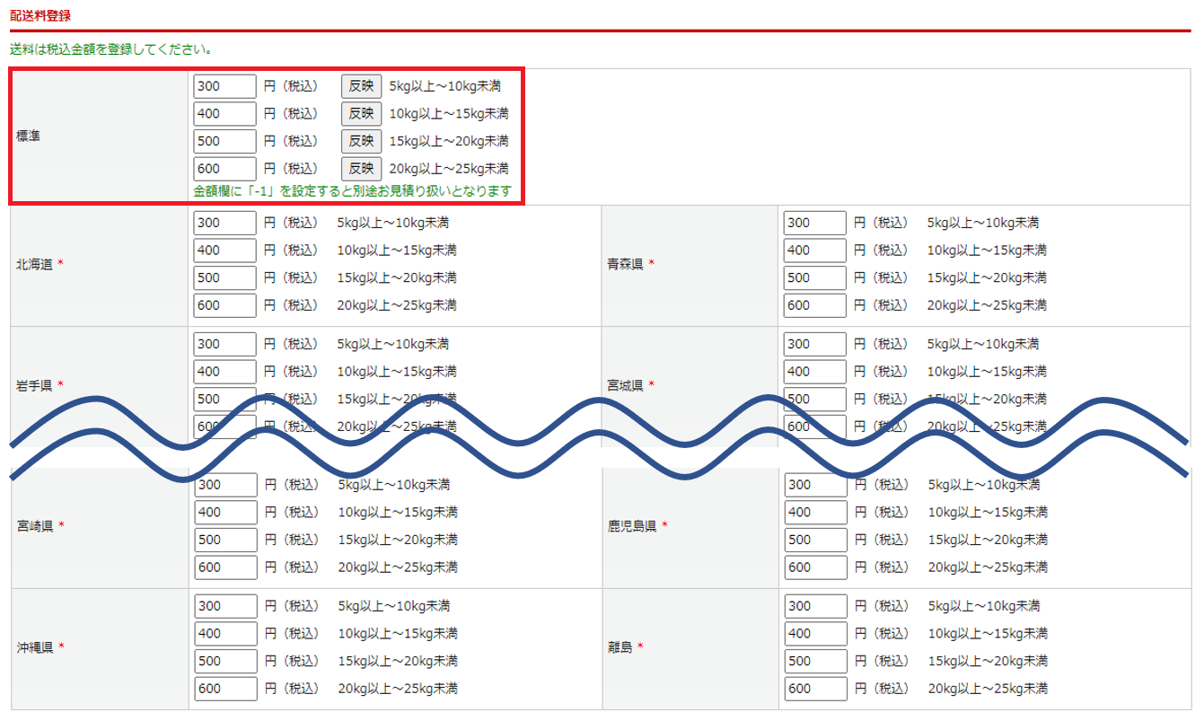 赤枠の”標準”で配送料を設定し、【反映】ボタンをクリックすることで、一括設定が可能です。