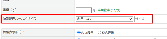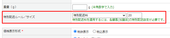 出品商品登録>[基本情報]タブ>基本情報>特別配送ルール/サイズ から設定します。