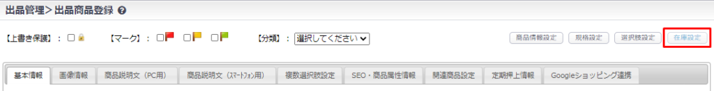 出品商品登録画面右上の【在庫設定】ボタンをクリックして、在庫(商品規格)登録画面を開きます。