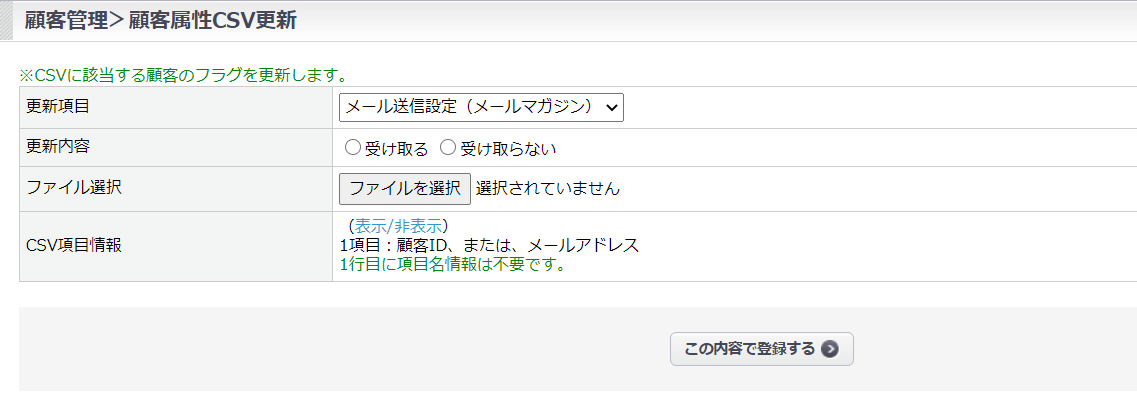 | ファイル選択 | 【ファイルを選択】ボタンをクリックし、更新対象とする顧客ID、またはメールアドレスを記載したCSVファイルをアップロードしてください。 ※CSVの1行目に項目名情報は不要です。 |