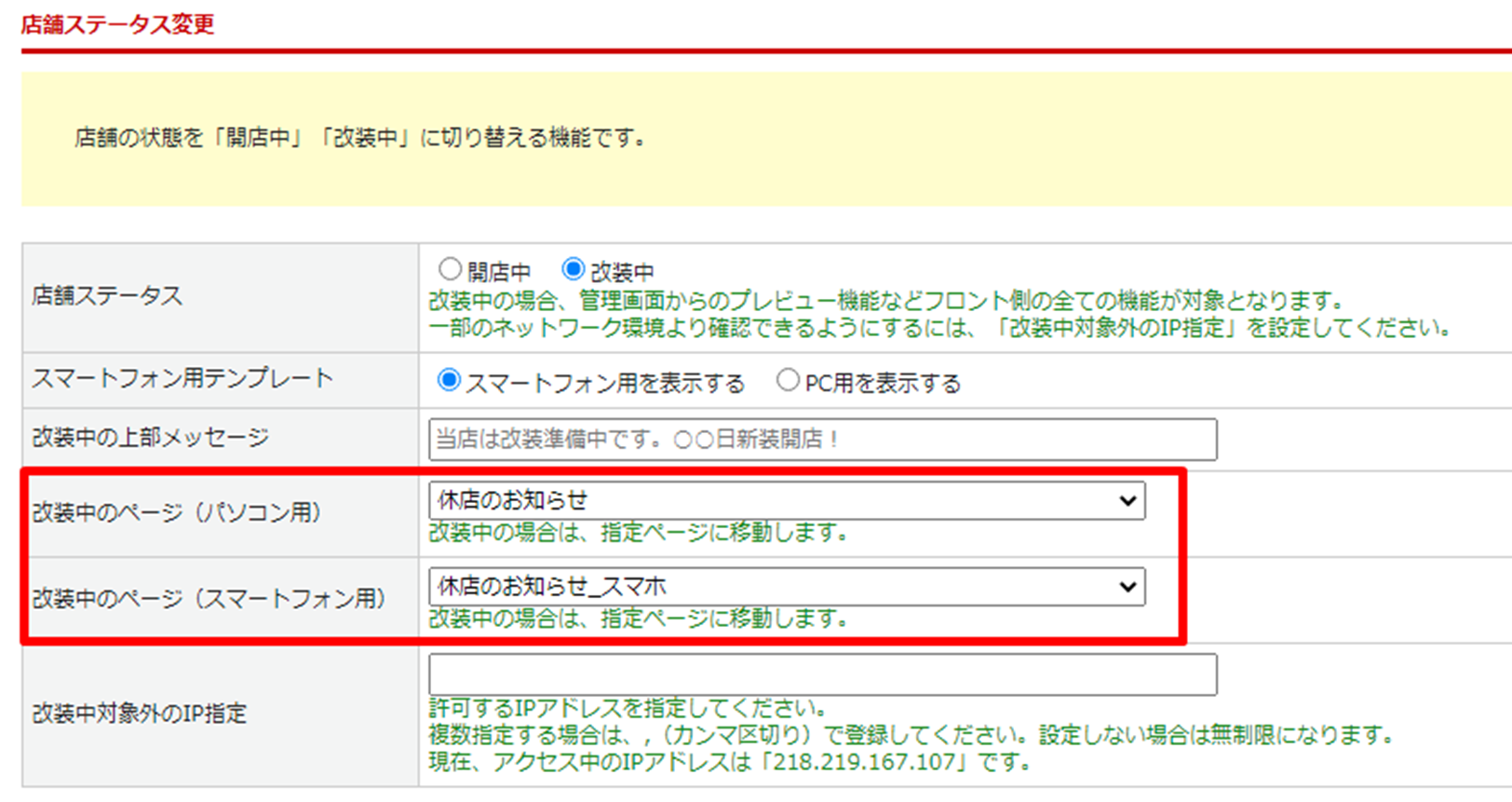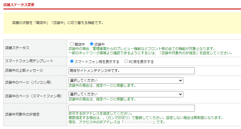 改装中:テストモード。「改装中対象外のIP指定」に入力したIPアドレスのみアクセス可能。