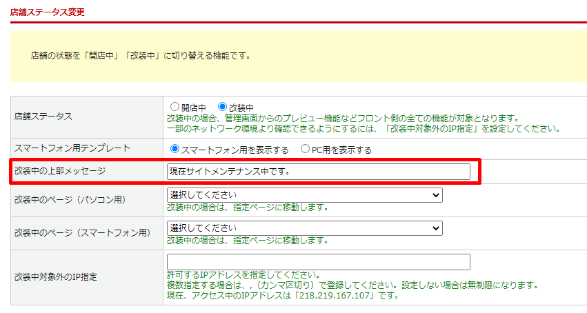 改装中の上部メッセージ改装中の場合、ページ上部に表示されるメッセージを設定できます。