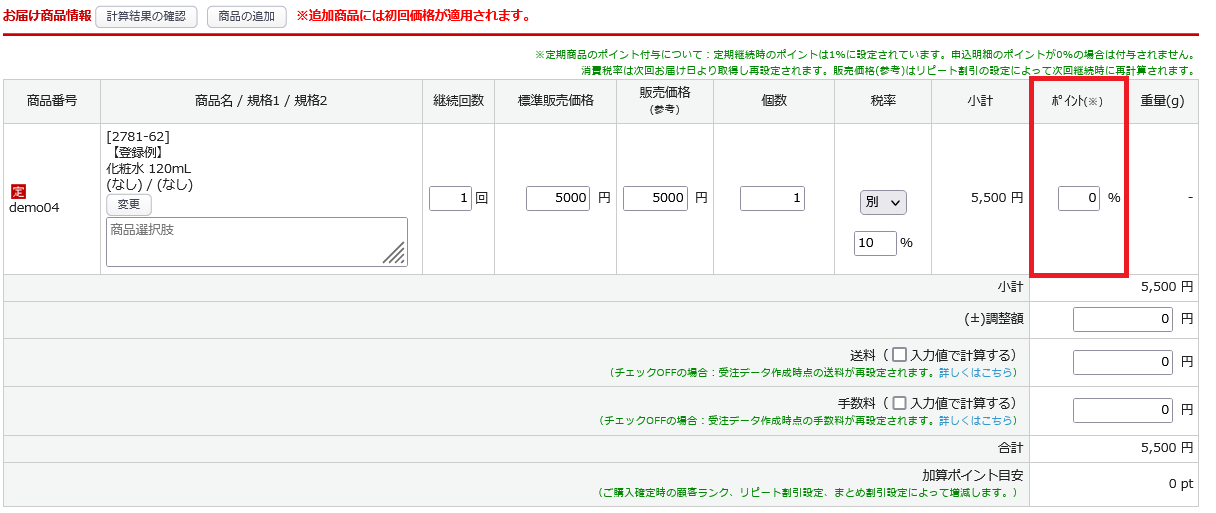 管理画面からの定期初回受注データ作成時は、「定期継続時のみ」「定期初回のみ」「出品マスタの設定通り」の場合に、出品マスタの付与率でポイントを算出します。「定期初回、定期継続時」の場合は、定期継続時のポイント付与率に則りポイントを算出します。