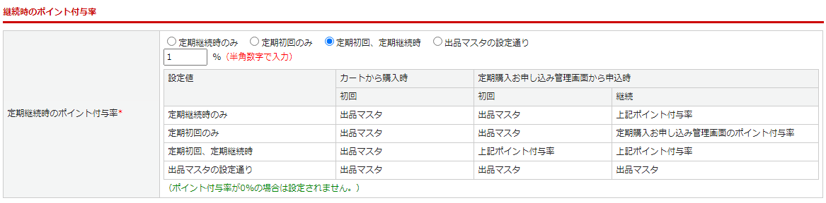 定期継続時のみ 定期継続受注データ(2回目以降)を作成する際に本設定で登録したポイント付与率を利用します。※定期購入お申込み情報に設定されたポイント付与率を変更しても、受注データ作成時に本設定で登録したポイント付与率に上書きされます。
