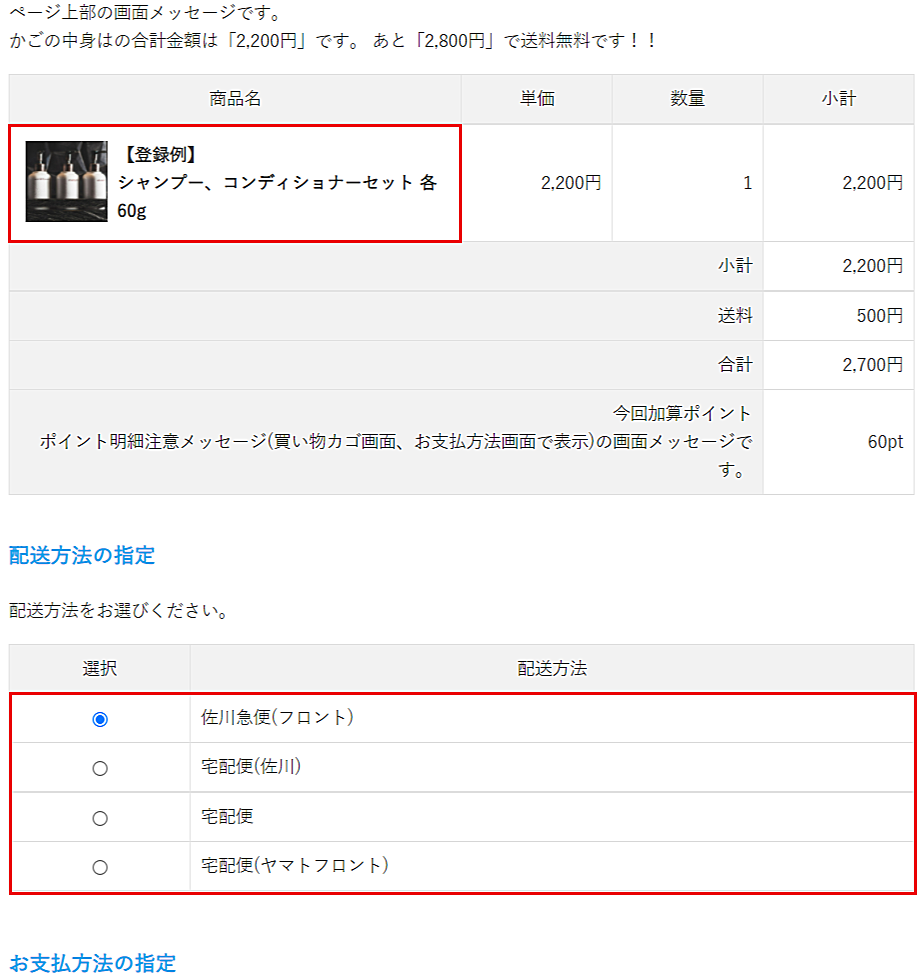 1.カートに投入されている商品に紐づく配送方法が表示されます。