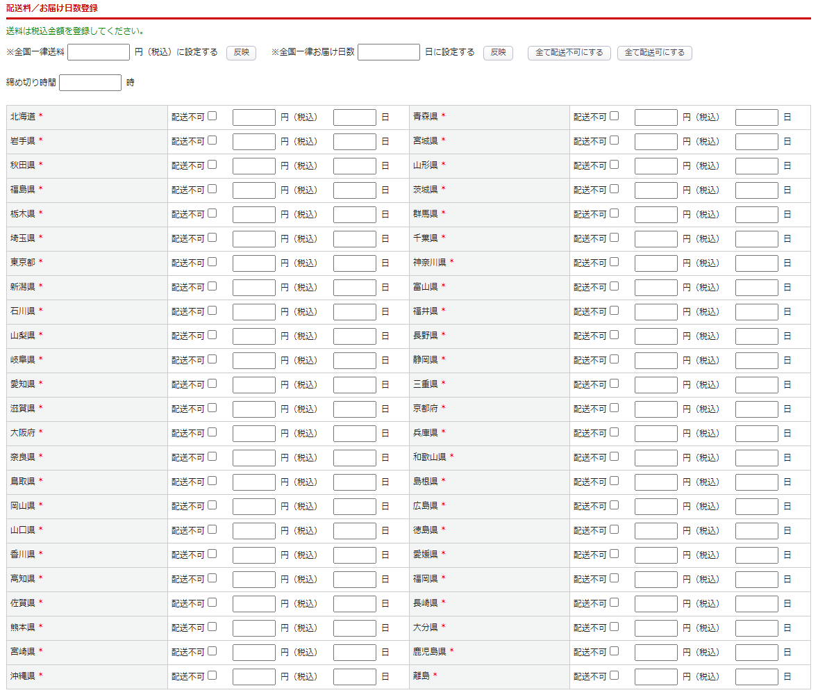 各都道府県名都道府県別に配送不可、配送料、お届け日数の設定が可能