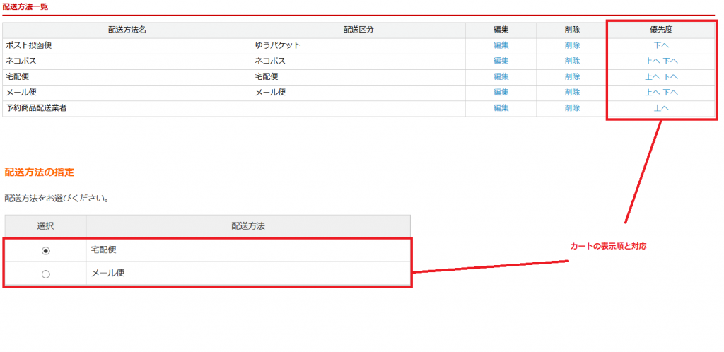 カートの配送方法表示順を変更したい 2018年9月7日 カート設定 ショップ基本設定>配送方法設定>配送方法一覧の「優先度」の項目で変更が可能です。 一覧で表示されている順でカート画面に表示されます。 ※カートに投入されている商品に紐づく配送方法のみ表示されます。 この記事で解決しましたか? 〇 はい 0 × いいえ 0 「カート内「その他お問い合わせ」の初期値設定について」 「フォーム一体型LP 商品設定について」