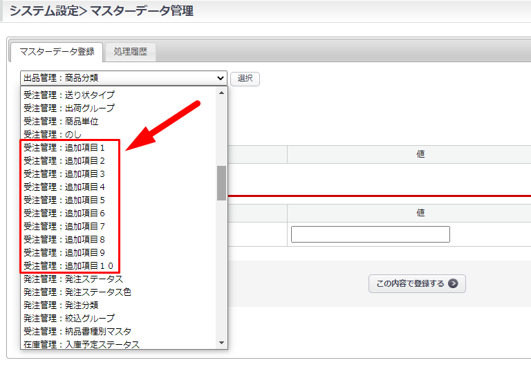 システム設定>マスター管理 から入力項目の選択肢を登録します。