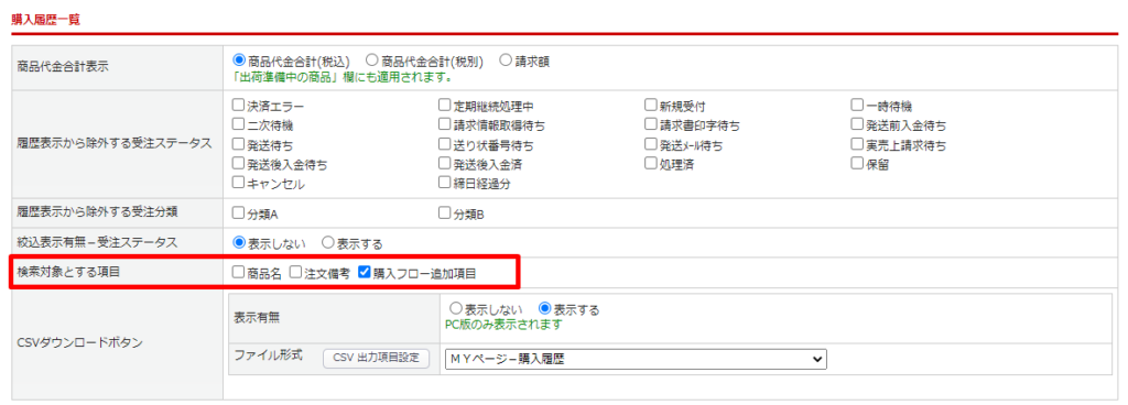 カートシステム設定>[MYページ機能設定]タブ の購入履歴一覧の項目「検索対象とする項目」の[購入フロー追加項目]にチェックをつけます。