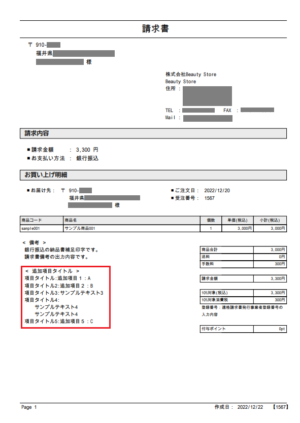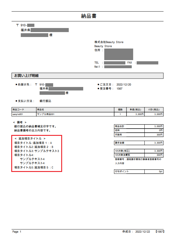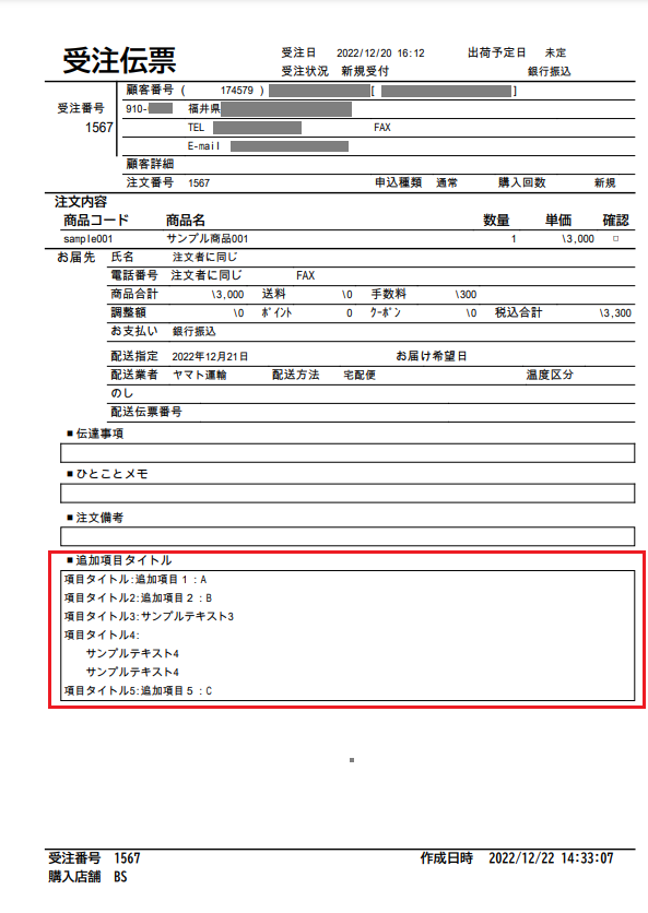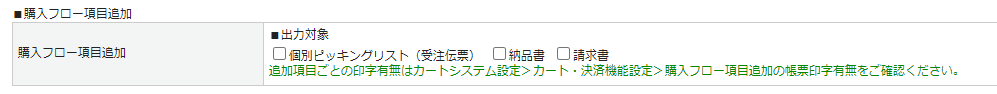カートシステム設定から、「帳票印字有無」を[表示する]に設定した追加項目が出力対象となります。