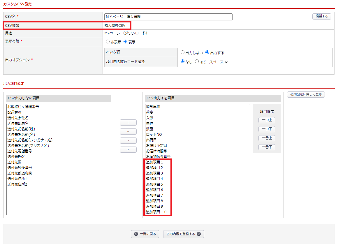 CSVの項目に「追加項目1~10」が追加されます。